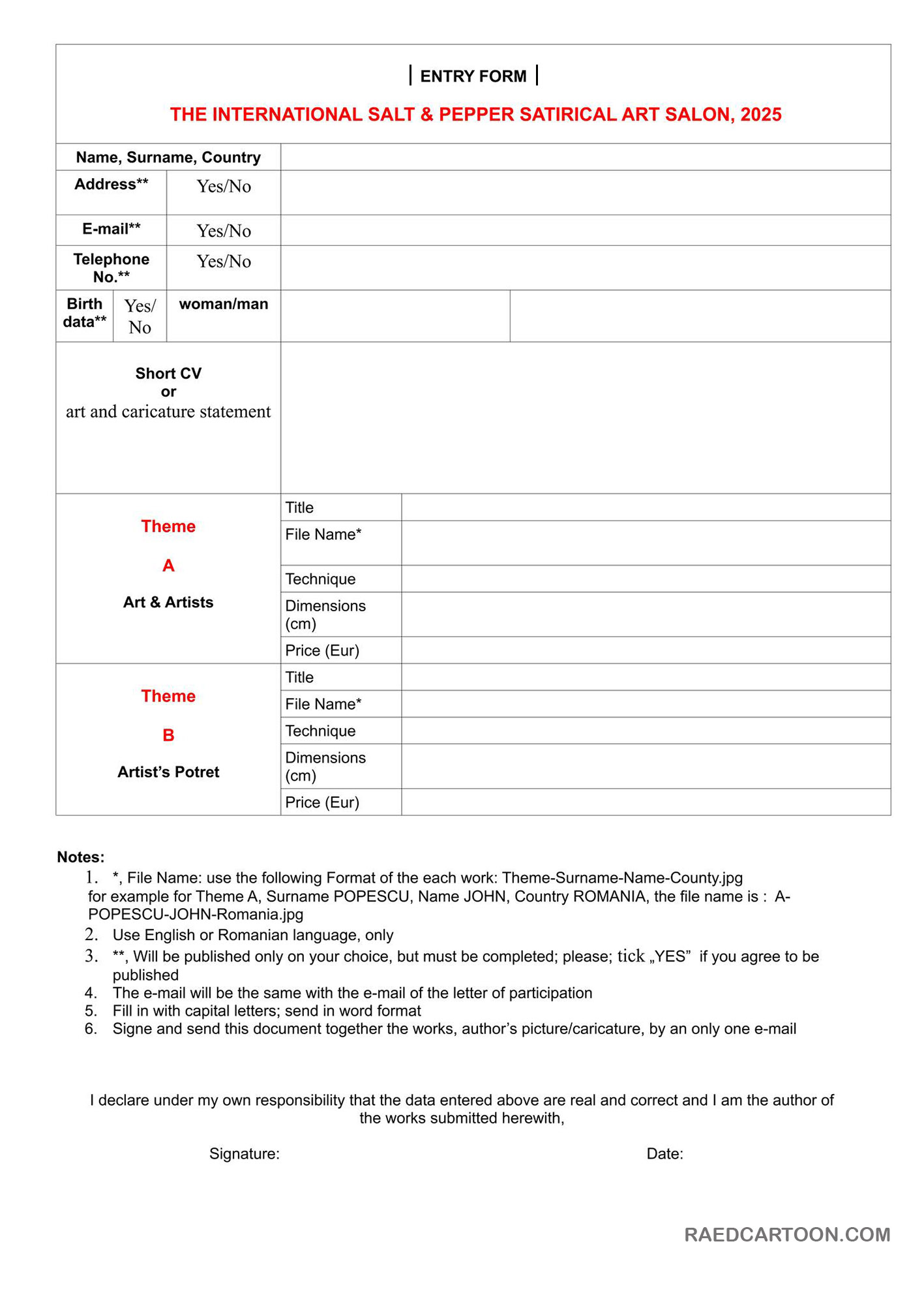 Will be accepted only ONE e-mail per participant, containing all works, requested information and documents: works, the personal photo/caricature – Max. 250KB, max. 300dpi, JPG, JPEG format and the completed and signed ENTRY FORM (in word’s format)