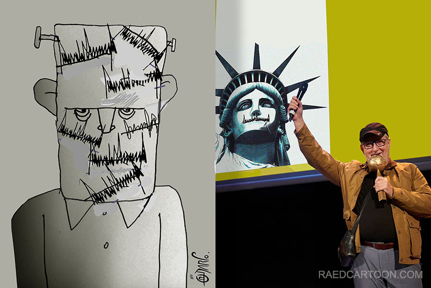 My work is created about two years ago. In the first edition, it was Frankenstein, which I embroidered with Trump’s signatures, but later I came up with a better idea with the Statue of Liberty. This work was first published on the state television portal, which can be easily checked at: rtcg.me. Later, in March 2025, I published this work in the magazine “Monitor” which I sent together with the works to the festival competition in Portugal.