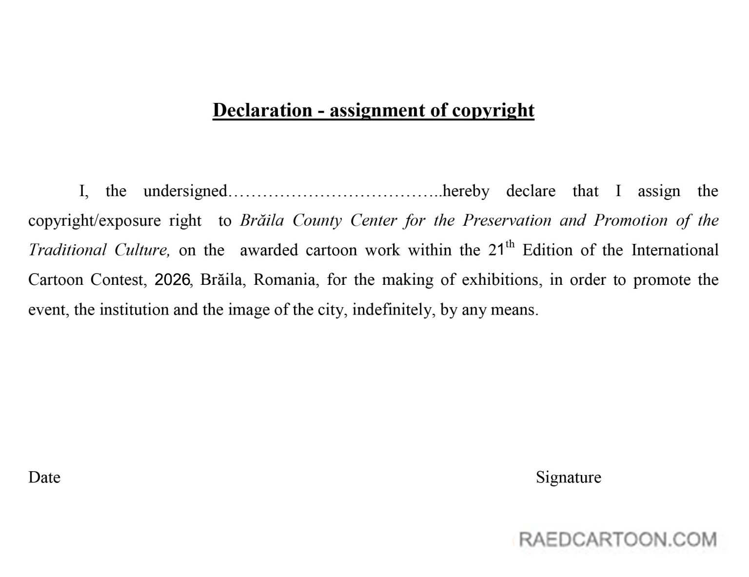 •The winners of the International Cartoon Contest transfer the ownership of the awarded works to the Organizer (Braila County Center for the Preservation and Promotion of Traditional Culture) at the time of sending over the original cartoon works to it.